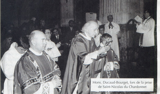 Entre le moment où les réformes liturgiques ont été appliquées puis exigées et celui au cours duquel Saint-Nicolas a été occupée, des dizaines de lieux plus ou moins insalubres ont été expérimentés par Mons. Ducaud-Boûrget et ses amis désireux de maintenir la messe traditionnelle à Paris. À l’hiver 1976-1977 avec son neveu, avec l’abbé Coache, l’abbé Serralda et Madame Buisson, il décida de célébrer la messe dans une véritable église pour marquer les esprits à l’occasion des élections municipales. Une fois l’assemblée envoyée, il pensait se retirer dans la sacristie préparée à la Mutualité. Or, ce qui devait être provisoire au cours d’une messe est devenu pérenne pendant quarante ans du fait des assistants si suppliants ! Sans doute, derrière la frêle figure du prêtre diocésain souffreteux se cachait une âme ardente qui avait connu la Grande Guerre, mêlant à la physionomie de Léon XIII celle du curé d’Ars. Mais il faut voir en Mgr Ducaud-Bourget un diplomate plutôt qu’un jusqu’au-boutiste, sachant allier l’humour à la plume plutôt que le sabre et l’amertume. D’ailleurs, il ne tenait pas à se laisser déborder par l’excès. Il renvoya des prêtres sédévacantistes de sa sacristie et il interdit qu’on ôtât le drapeau du Saint-Siège dans le chœur de l’église qu’il avait délivrée.