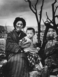 [Ci-contre : Une mère et sa fille dans les ruines d’Hiroshima, décembre 1945. Photo prise au Leica par Alfred Eisenstaedt, quatre mois après le lâcher de la bombe atomique]