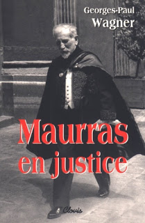 [Charles Maurras, lors de son procès (couverture de Maurras en justice de feu Georges-Paul Wagner). Le vieux maître s’y est mué en accusateur, terminant du même coup sa carrière en beauté sans capituler. Comme nous l’explique Pierre de Meuse, en recensant le livre du maurrassien Christian Perroux, l’Action Française fut sans cesse tiraillée entre sa tentation grecque / païenne et sa tentation catholique opportuniste. Cette dernière semble triompher chez les rescapés actuels du maurrassisme]