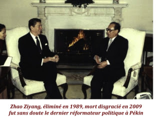 Jusqu’ici, le seul réformateur politique qu’ait vraiment connu la Chine de Mao, s’appelait Zhao Ziyang. Dans le sillage de Deng Xiaoping, uniquement soucieux quant à lui d’efficacité économique, il fut premier ministre de 1980 à 1987, secrétaire général du parti de 1987 à 1989. Au départ, il faisait donc partie du cercle dirigeant le plus étroit. Écarté et mis en résidence surveillée à après les manifestations de la place Tian Anmen en 1989 où il avait apporté son soutien aux étudiants. Il demeura disgracié pendant 20 ans et mourut en 2009.