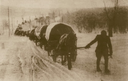 [Ci-contre : L’exode vers l’Ouest des paysans de Prusse orientale en 1945]