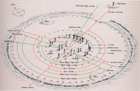 L’autre exemple qui prouve que l’observation des constructeurs préhistoriques de mégaliques pouvait être d’une précision extrême est celui de la dernière phase du monument de Stonehenge, système de fossés circulaires et de pierres dressées, délibérément orienté à partir d’un aménagement des trilithes disposés en U, entourant l’observateur situé au centre du dispositif en cercle, et visant à travers 2 pierres rapprochées l’endroit exact où le soleil apparaît à l’horizon, le jour du solstice d’été. Si cet axe de la phase 1, antérieure aux trilithes, reste approximatif en cadrant un angle entre 27°N et 24°N, le nouvel aménagement est très précis et juste ; il est celui de la quatrième et dernière phase, contemporaine de l’implantation de 2 nouveaux menhirs laissant passer exactement la ligne d’observation allant du centre du site au point d’apparition du solstice d’été, selon l’axe principal de 24°N. Cette troisième phase est datée de 2250 à 1900 avant notre ère. C’est elle qui est encore, de nos jours, le cadre des célébrations contemporaines du solstice d’été ».