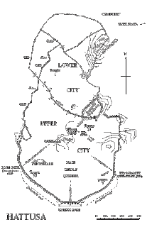 À Hattussa, ville de montagne, la moindre éminence de pierre est mise à profit pour bâtir et les ravins deviennent des barrages infranchissables pour l’ennemi. Tandis que des passages souterrains, à l’issue dissimulée, creusés sous les portes des fortifications, permettent la fuite à tout moment. Ce système de poternes semble une innovation des Hittites. La sécurité de Hattussa repose sur une organisation administrative complexe : le soir venu, un oeazannu — l’équivalent d’un bourgmestre — veille à la fermeture des portes de la cité et pose un scellé arborant sa marque personnelle. À l’aube, le cachet doit être intact, preuve qu’aucun intrus n’a porté atteinte à l’intégrité de la ville… La sécurité alimentaire n’est pas en reste : des aqueducs canalisent, depuis des sources extérieures, l’eau stockée dans des bassins aux parois recouvertes d’argile, et l’on a trouvé des silos à grains dans la partie basse de la ville. D’après leur contenance, on peut estimer la population de Hattussa entre 10.000 et 20.000 personnes.