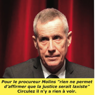 C’est en considération de ces polémiques que, plus généralement, le procureur Molins croyait pouvoir certifier, dans un entretien publié par Le Monde ce 24 avril que, selon lui, « rien ne permet d’affirmer que la justice serait laxiste ». Circulez il n’y a rien à voir.[2]
