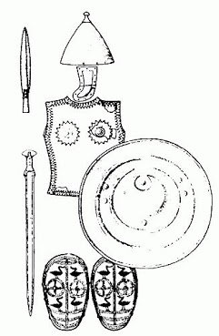 Armement de guerrier de l’Âge du Bronze danubien ou centre-européen, influencé de façon déterminante par la civilisation du Bronze nordique. Ces armes se retrouveront plus tard en Grèce et en Crète, ce qui prouve une migration de peuples selon l’axe Jutland / Panonnie / Grèce.
