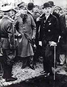 Ci-contre : Deux personnages importants de la République de Weimar : von Papen et Kurt von Schleicher, ici en 1932, respectivement alors Reichskanzler et Reichswehminister, lors d’une commémoration militaire à Berlin. Von Schleicher constatera que son armée ne pouvait contenir les éléments communistes et nazis si ceux-ci unissaient leurs forces. Son objectif : maintenir le statu quo (réparations incluses) en demandant aux Alliés de pouvoir disposer de 300.000 hommes. Cette éventualité inquiétait les Soviétiques, car elle aurait pu déboucher sur une alliance franco-germano-polonaise. Le conflit entre von Schleicher voulant temporiser la situation socio-politique et l’ultraconservateur von Papen décrétant la loi martiale ne fera que rendre plus instable le gouvernement de Hindenburg.
