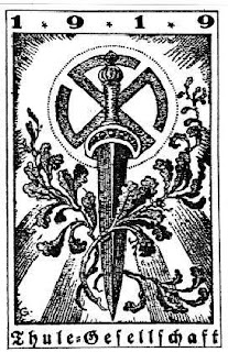 [ci-contre : Emblème de l’organisation paramaçonnique munichoise Société Thulé (fondée en 1918) représentant le svatiska dextrogyre aux branches recourbées, rayonnant et surplombant un poignard. La date du dessin est indiquée : 1919. Le svastika, courant dans l’iconographie aryosophiste de l’époque, sera repris comme croix gammée par le NSDAP. Peut-on considérer l’ésotérisme nordiciste comme préfigurant le régime hitlérien qui en serait le versant exotérique ? Une étude récente aide à faire la part du mythe et de la réalité sur ce sujet. En voici la recension]