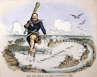 Washington invente la politique du « gros bâton » (big stick). Cette caricature, réalisée en 1904 par un journaliste américain, W. A. Rogers, résume bien la politique latino-américaine de Théodore Roosevelt, vingt-sixième président des États-Unis de 1901 à 1909. La Mer des Caraïbes y apparait transformée en un lac yankee avec l’aide de la flotte américaine. La présence d’un navire baptisé « l’USS Debt Collector » (Navire de l’Armée américaine « Collecteur de Dettes ») nous montre que l’utilisation de la dette publique des États étrangers comme un moyen de mise sous tutelle était déjà courante à l’époque. La Banque mondiale ou le FMI ne sont sont donc pas novateurs en ce domaine]