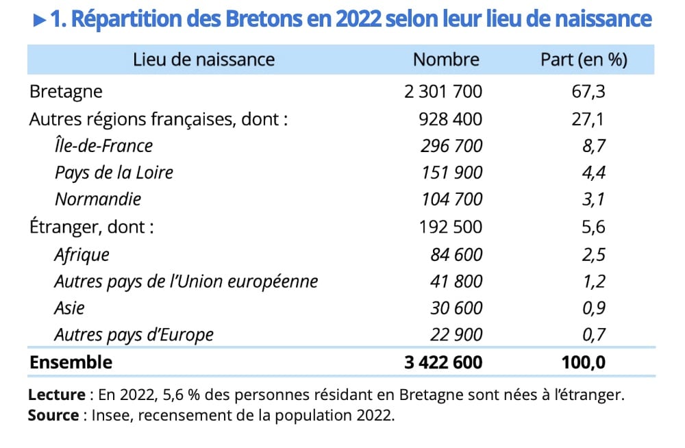 En 2022, sur les 3,42 millions de personnes résidant dans la Bretagne administrative (quatre départements), seulement 2,3 millions sont nées dans la région, soit 67,3% de la population. À l’inverse, 1,12 million d’habitants sont nés en dehors de ces quatre départements, dont 192 500 à l’étranger.